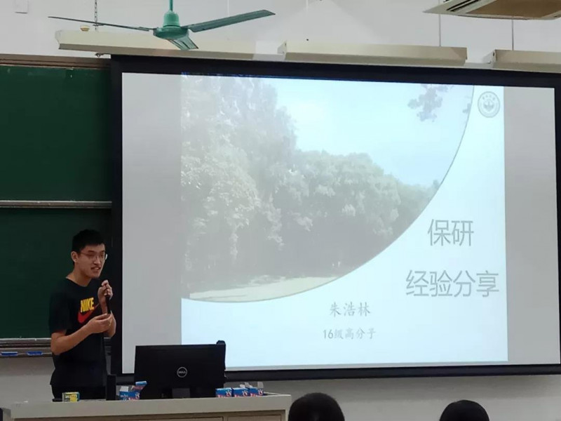 首先走上来的是2016级高分子材料与工程在读的朱浩林同学,他将分享重点放在保研的筹备阶段。