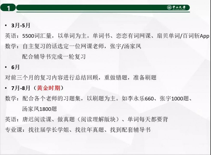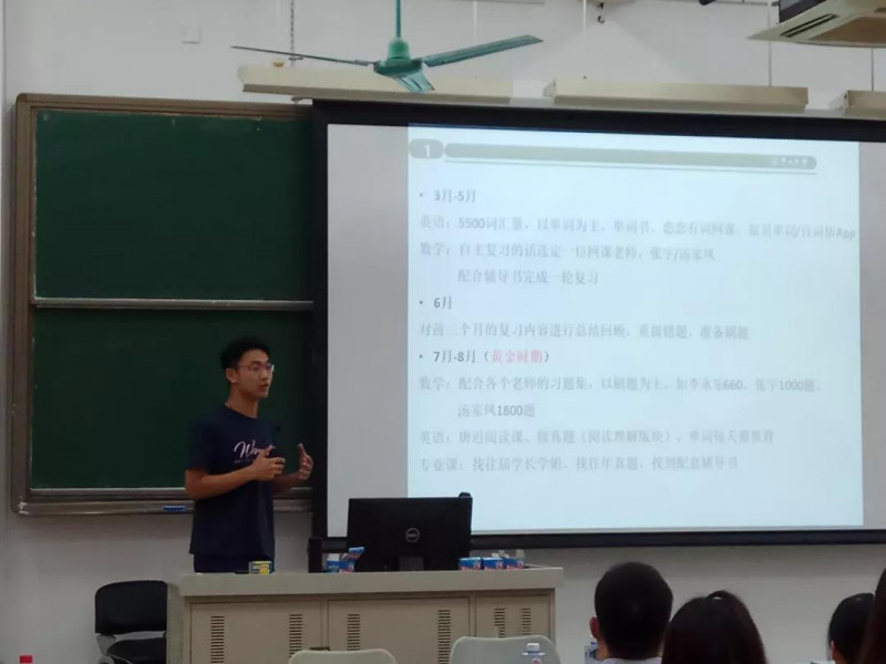接下来分享经验的是2019级专硕在读的王冠初同学。他的发言主要集中在考研的准备。从时间段的划分,到每门课程如何选择辅导书、选择网课老师,再到如何把握好每一天等等,让人收获良多。