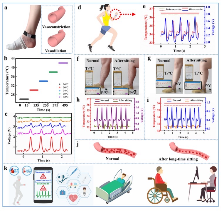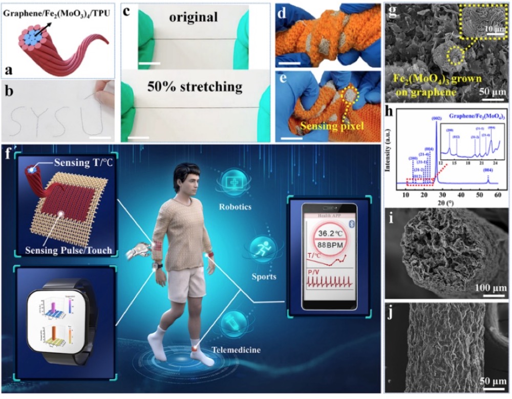鉴于此,304永利集团材料科学与工程学院衣芳教授课题组开发了一种能够同时检测和区分温度和脉搏/触摸的多模态智能织物。该智能织物不仅具有高检测性能、信号互不干扰的特点,而且制造简单并且可以对信号进行实时监测。该织物传感器可输出两个相互独立的信号,从而输出信号互不干扰。织物基摩擦纳米发电机(TENG)通过输出电压信号来检测脉搏,而织物内芯(TENG的工作电极)为热电阻纤维通过输出电阻信号来检测温度。微纳多孔热电阻纤维(graphene/Fe2(MoO4)3/TPU)通过在石墨烯表面生长纳米钼酸铁然后与TPU复合经湿法纺丝而制备,不仅具有良好的可拉伸性和热稳定性,并且与目前已报道纤维基温度传感器相比,具有最高的热灵敏度(β= 4994.55 K,26~50 ℃)和最快的响应/回复时间(97 ms/239 ms),而且其温度传感性能对各种应变(拉伸、弯曲和压力)不敏感。此外,这种基于纳米钼酸铁生长于石墨烯的热电阻纤维比基于纳米钼酸铁直接混合石墨烯的热电阻纤维具有更高的温度传感性能(热灵敏度高约3.2 倍)。基于此微纳多孔热电阻纤维编织而成的解耦多模智能传感织物可用于健康监测,同时提供准确的人体温度和脉搏信号,从而提供更准确、更有价值的健康状况信息。这项工作中展示的概念也可以扩展到其他领域,如机器人、假肢和智能家居系统等。