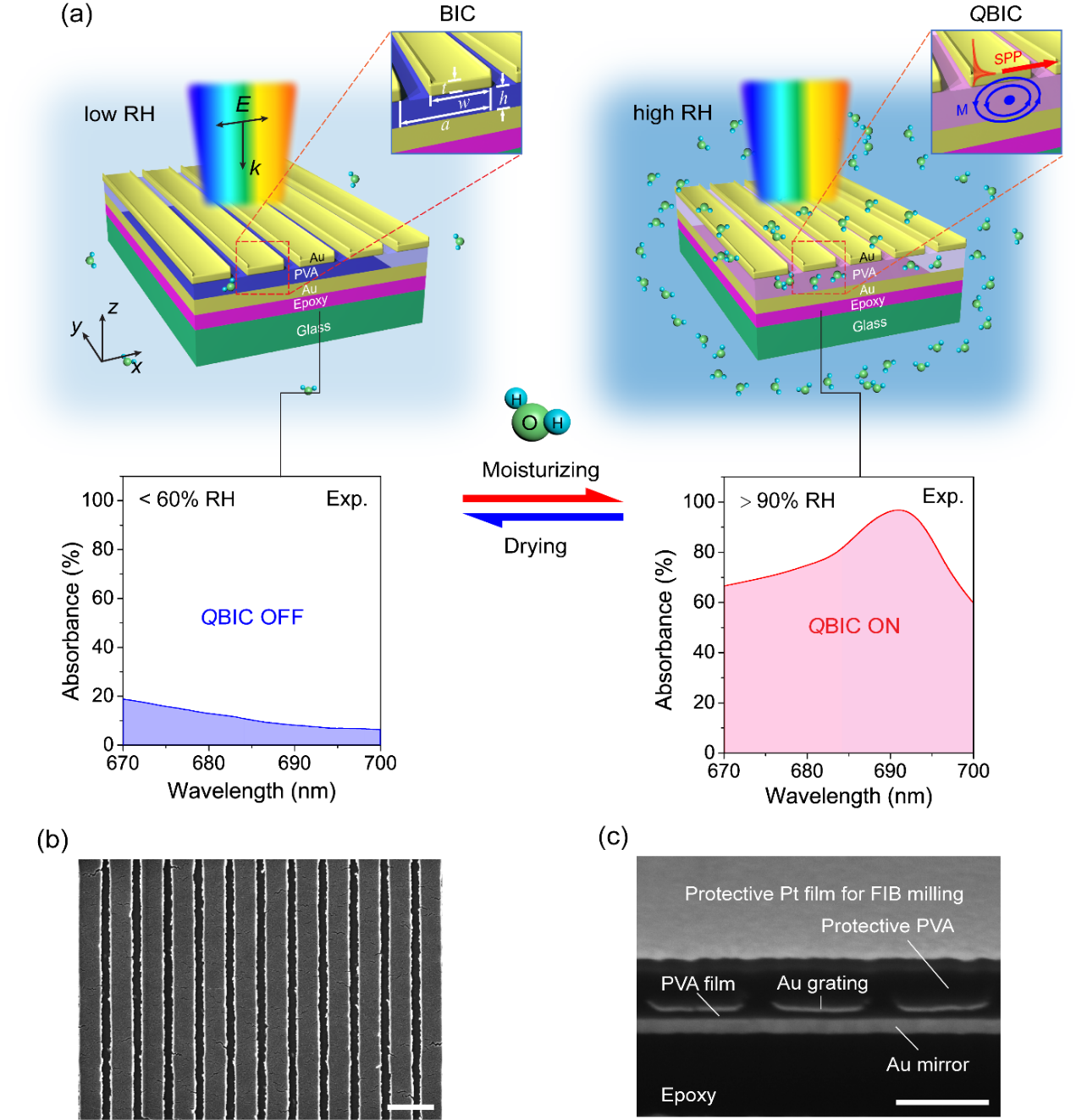 近期,金崇君教授、沈杨副教授研究团队基于连续体中的束缚态(Bound state in the continuum,BIC) 的概念,设计了一种基于金属-水凝胶-金属 (Metal-Hydrogen-Metal, MHM) 三明治结构的光学调制器。该调制器通过环境湿度的改变来精确控制上层金光栅和下层金反射镜之间的纳米级间隙(即中间层PVA的厚度),进而调控上下金层之间的纵向耦合行为,最终实现了可见光区等离激元模式的完全切换。相关实验和模拟结果揭示了如此高的调制深度得益于MHM结构中湿度诱导的BIC-准BIC转化。如图1所示,当样品处于较低的环境湿度(< 60 %RH)时,MHM中的磁模式和SPP模式的辐射通道干涉相消,整个体系展现出一个完全的暗模式,即一条平坦而微弱的吸收谱线(BIC态);而当湿度升高时(> 90% RH),PVA吸水溶胀厚度增加,破坏了磁模式和SPP模式的相干,其BIC态在极短时间内(~0.3秒)便塌缩成一个尖锐的Fano共振峰(准BIC态),从而实现调制深度高达-14.6 dB的光学开关调制。