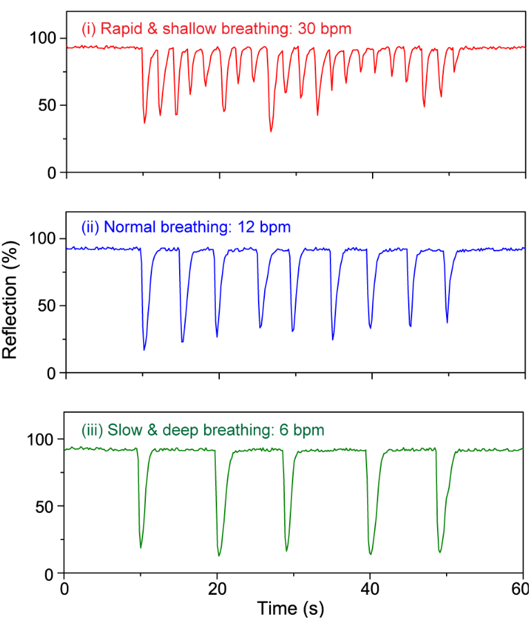 基于超高的光学反差、亚秒级的响应时间以及不受电磁干扰的优势,MHM结构被进一步应用到人体呼吸频率监控上。如图2所示,根据所记录的呼吸脉冲信号的强度和间隔,可以轻松识别出不同的呼吸模式。同时,可检测的最大呼吸频率达到30次/分钟 (breaths per minute,bpm)。这说明基于MHM结构的光学呼吸频率传感器有望作为一种代替方案,应用于传统的电学呼吸传感器失效的场景,例如用于进行核磁共振成像和放疗的病人身上。