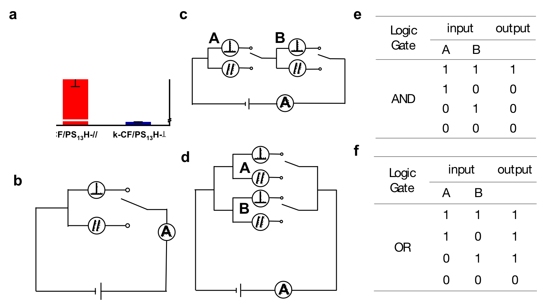 图3 (a)水凝胶的各向异性电导率;(b)基于各向异性水凝胶的逻辑门单元;(c)“与门(AND Gate)”,(d)“或门(OR Gate)”和(e,f)相应的赋值表。