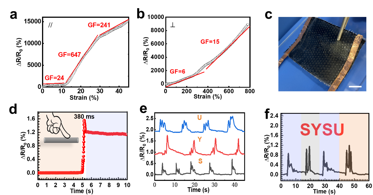 图4 复合水凝胶在(a)平行和(b)垂直于碳纤维方向的传感灵敏度;(c)碳纤维编织布复合水凝胶书板照片,标尺:2 cm;(d)书写板的响应时间;(e,f)在书写板上分别写出字母“S”、“Y”、“U”和“SYSU”对应的电阻变化率。