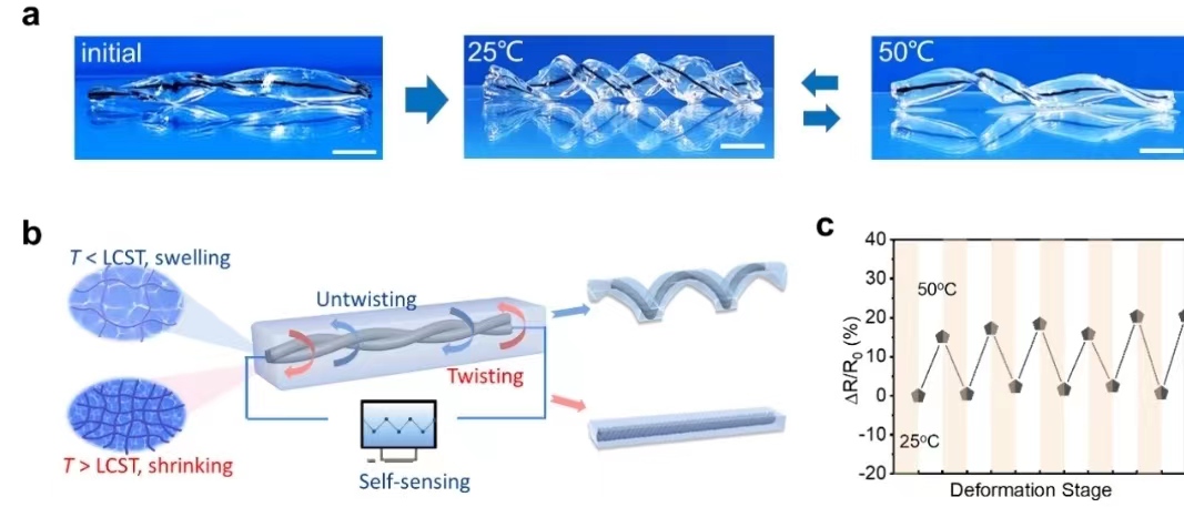 该研究为为制备具有优异力学性能和灵敏度的仿生各向异性水凝胶传感器和驱动器开辟了新途径,为实现传感与驱动的融合提供了新思路,对发展柔性人工智能机器人等具有重要的意义。