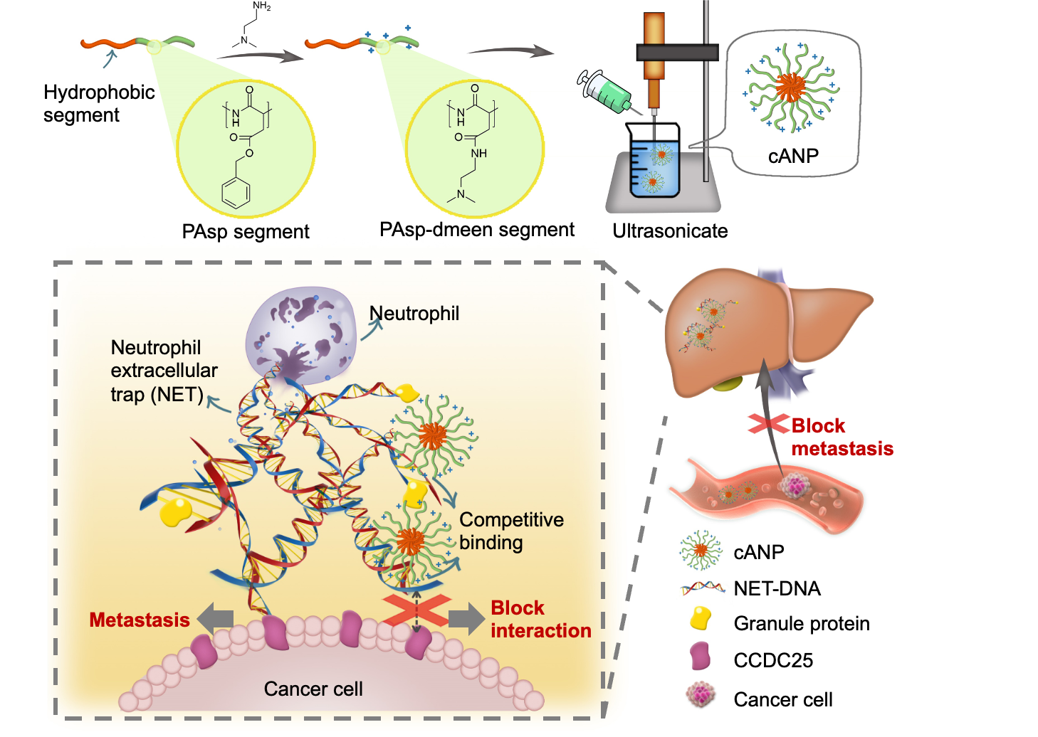 图1. cANP的制备和通过结合NET-DNA抑制NET诱导的肿瘤转移的示意图