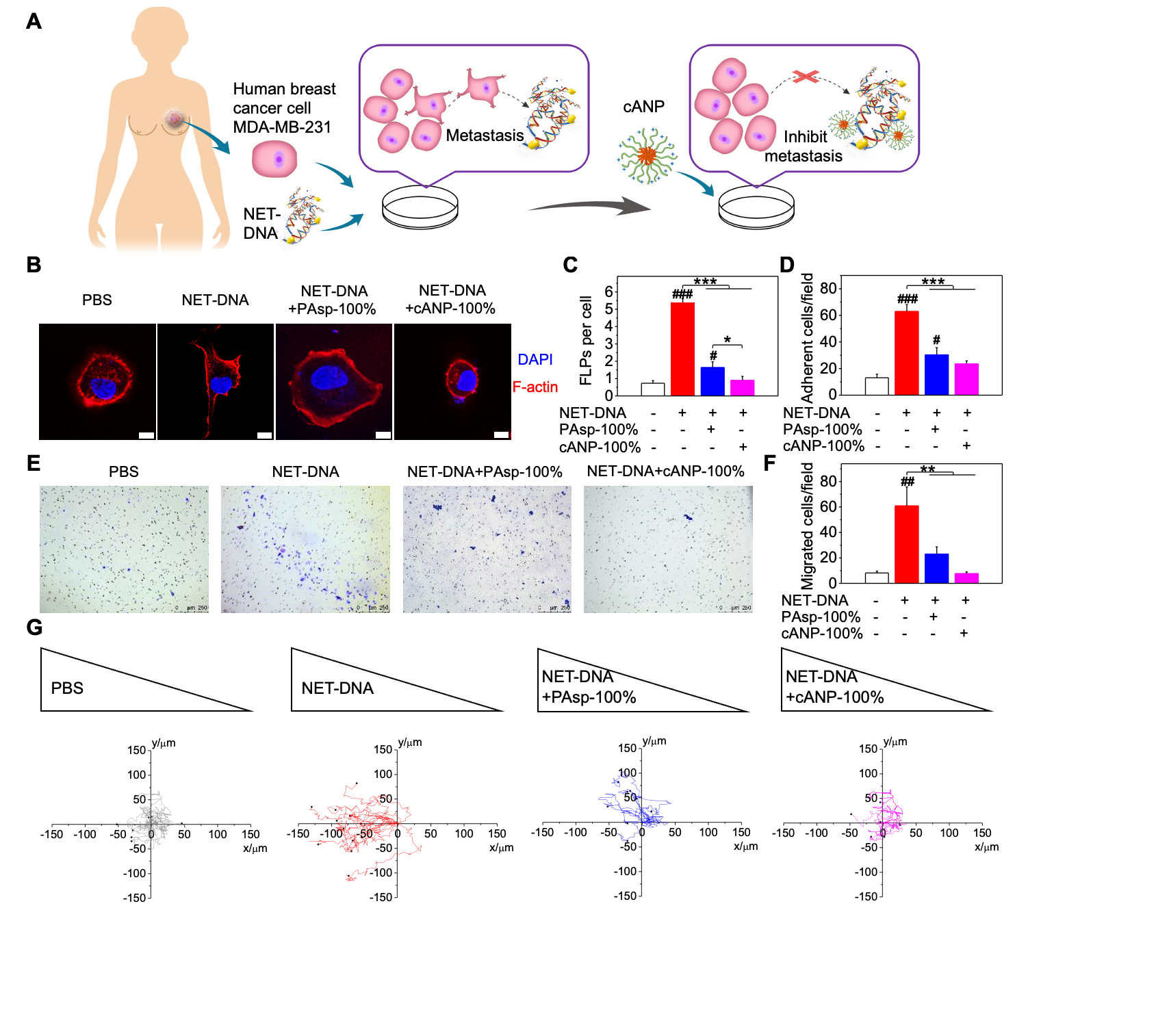 图2. cANP 抑制人乳腺癌肿瘤细胞中由NET-DNA诱导的细胞趋化功能。(A)cANP通过结合NET-DNA抑制NET介导的人乳腺癌细胞转移的示意图;(B-C)阳离子聚氨基酸材料中和NET-DNA抑制NET-DNA诱导的癌细胞骨架变形(B-C)、癌细胞粘附(D)、癌细胞迁移(E-F)与癌细胞趋化能力(G)。