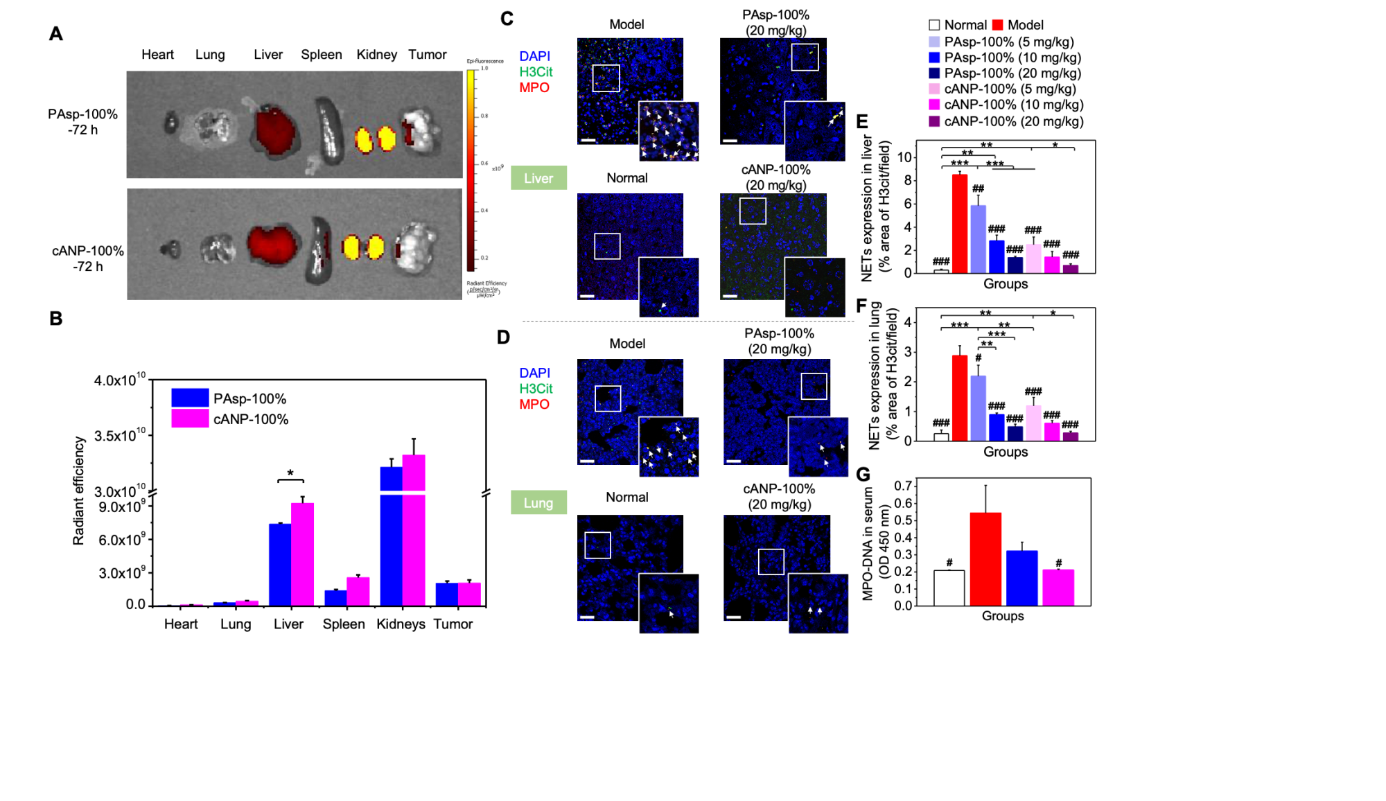 图3. 在肝脏有更好积累的cANP能更好地减少小鼠原位乳腺癌模型局部NET的浸润以及血清中NET-DNA的含量。(A-B)72小时PAsp-100%与cANP-100%在体内的分布情况;(C-F)不同组别中NET在乳腺癌模型肝脏(C, E)和肺部(D,F)的浸润情况;(G) 血清中MPO-DNA的浓度。