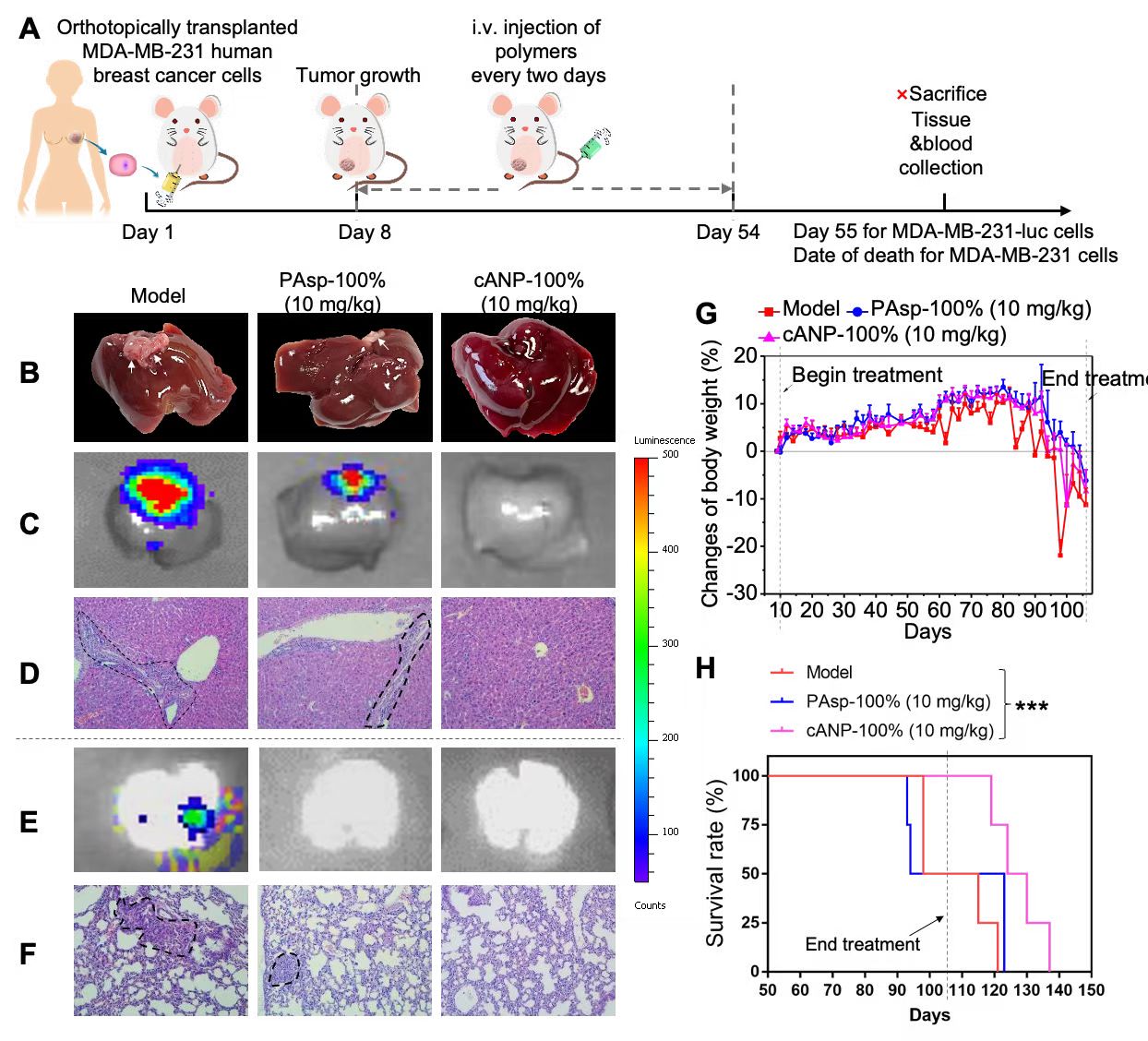 图4. cANP-100%的治疗有效减少MDA-MB-231人乳腺癌原位模型中癌细胞的肝转移和肺转移。(A)MDA-MB-231原位乳腺癌模型的实验流程图;(B)cANP-100%的治疗有效减少肝肿瘤结节数;(C)luminescence图显示cANP-100%有效抑制MDA-MB-231-luc肿瘤细胞向肝脏的迁移;(D)HE组织切片显示cANP-100%治疗后肝脏没有明显的肿瘤细胞浸润;(E)luminescence图显示阳离子聚天冬氨酸材料都有效抑制MDA-MB-231-luc肿瘤细胞向肺部的迁移;(F)HE组织切片显示cANP-100%组肺部没有明显的肿瘤细胞浸润;(G)治疗过程中小鼠的体重变化(H)cANP-100%的治疗有效延长肿瘤小鼠的生存期。