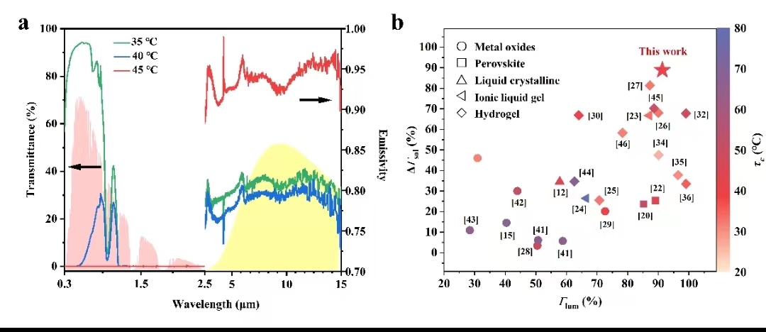 建筑能耗约占全球能耗的40%,而窗户是建筑内外能量交换的主要通道。利用智能窗户调节建筑能量交换,是实现建筑节能的重要手段。国内外科学家们已经开发了各种智能窗户,如:热致变色型水凝胶智能窗户(Joule, 2019, 3, 290-302),电致变色型钙钛矿智能窗户(Nat. Commun. 2021, 12, 3360),辐射制冷型二氧化钒智能窗户(Science, 2021, 374, 1501-1504)等。研究和开发“全气候”型智能窗户,既能在夏季阻隔过多的阳光直射,又能在冬季降低室内热能的辐射损失,“冬暖夏凉”,不仅有利于显著改善建筑内的舒适性,更有利于节约能源,促进低碳经济发展。然而,大多数智能窗户仍受制于需要供能、工作温度适用范围窄、光调节能力不足等问题。因此,研究可自发调节并适应复杂多变气候的智能窗户具有非常重要的科学意义和应用价值。