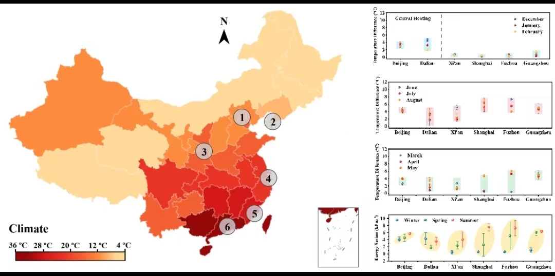 研究团队通过多个城市、不同季节的室内模拟测试,证实了该智能窗户具有室内温度调节能力和建筑节能效果。选取北京、大连、西安、上海、福州和广州作为代表性的试点城市,跨越北纬23 °N 到40 °N,覆盖了亚热带、温带、沿海、内陆等不同地理和气候特点,从2021年12月到2022年8月,进行了为期九个月的室内模拟测试(图3)。在北方,模拟冬季供暖条件,利用智能窗户的热致变色效应,有效地降低了室内热量的辐射逃逸,表现出优异的建筑节能效果(4.04-4.30 kJ m-3)。在春季,广州的智能窗户可将室内温度降低4.0 °C左右,并节能5.14 kJ m-3。在夏季,随着气温进一步升高,智能窗户在所有城市均展现优异的温度调节能力(最高可达7.3 °C),其建筑节能效率可达9.51 kJ m-3