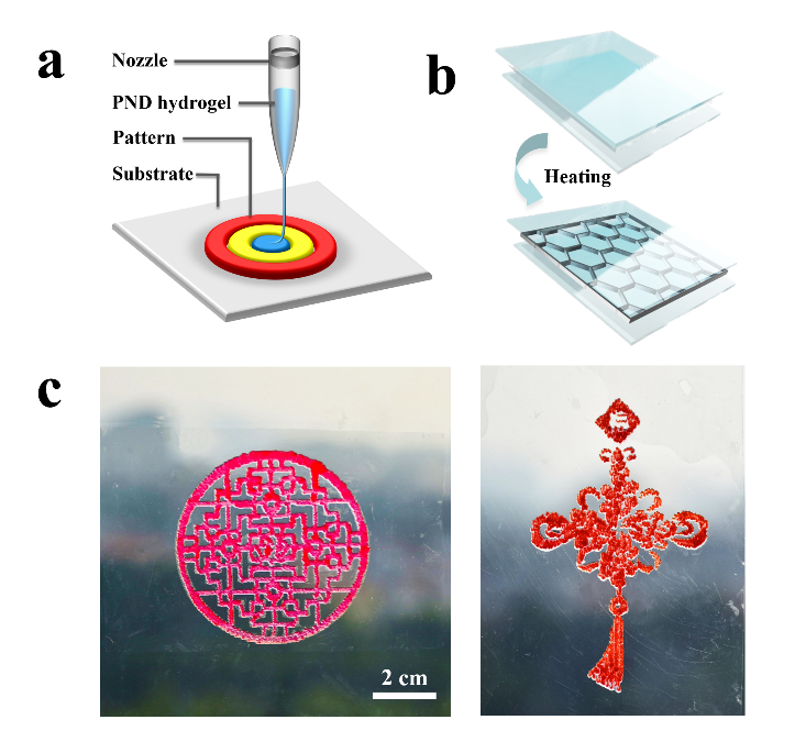 图4 (a) 3D打印的图案化水凝胶凝胶智能窗,(b)兼顾了窗户可视化和光调节,(c)智能窗户与窗花、中国结等文化元素结合。