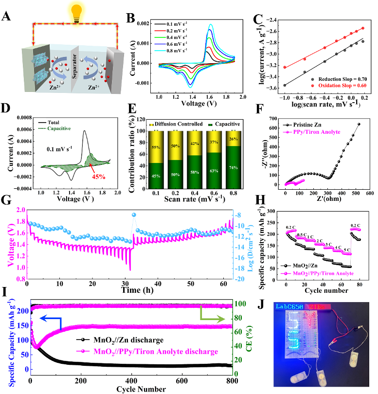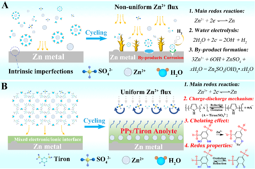 课题组提出了一种电荷转移型人工固体电解质保护层的制备方法,利用阳极电解液添加剂(Anolyte)的氧化还原作用提升保护界面的电化学性能。电荷转移型固体界面由带正电的聚吡咯和带负电的1,2-二羟基苯 -3,5-二磺酸钠(Tiron)所构成,通过优化混合导电界面层的结构形貌特性用于修饰锌负极。研究对比了化学聚合和电化学聚合法制备保护界面,分析了有/无掺杂剂和掺杂剂浓度对合成材料形貌、粒径大小及分布的影响。结果表明,酚羟基官能团提高了聚吡咯与基底之间的螯合作用,同时促进了电解液的氧化还原反应。 此外,引入磺酸根能够重塑硫酸锌中[Zn(H2O)6]2+的溶剂化壳结构,减弱水分子的电化学活性。在“充电-放电” 过程中,电荷转移型固体界面通过聚吡咯的掺杂/去掺杂行为促进 了Tiron 在电极表面的吸附/解吸,外加电场导致了“Zn2+-Tiron”络合物的氧化,生成的中间产物释放出金属离子,利用苯酚到苯醌的相互转化,增强了“电极-电解液”之间的电荷转移。