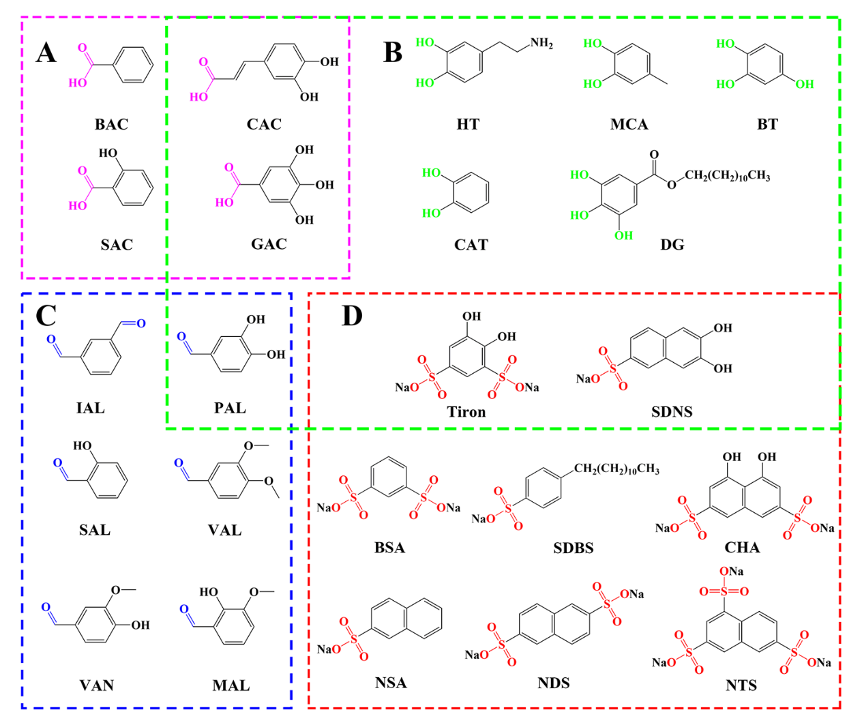 图3 功能设计芳香分子电解液添加剂:含有(A)羧基,(B)羟基,(C)醛基和(D)磺酸基的添加剂分子结构图。