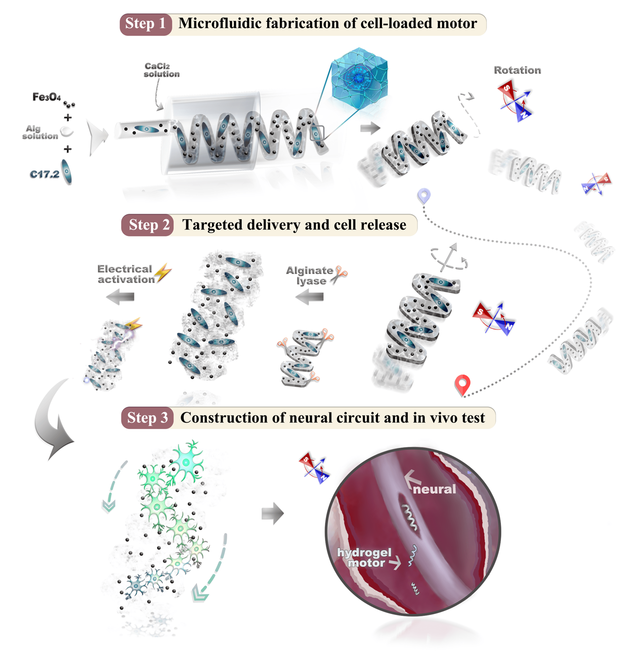 图1 负载神经干细胞的螺旋水凝胶微马达的制备及其应用于神经再生