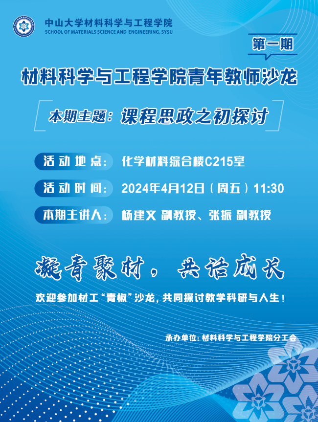 为促进学院青年教师的交流,帮助青年教师更好成长,凝心聚力、弘扬学院优良传统和文化,学院定于4月12日(星期五)举办材料科学与工程学院青年教师沙龙(第一期)。