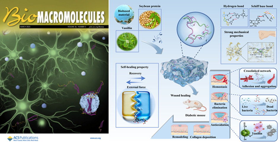 近日,我院该课题组在美国化学学会知名学术期刊《Biomacromolecules》杂志发表题为“Novel Physicochemical Reversible Dual-Crosslinked Biobased Hydrogel: Self-Healing, Antibacterial, Antioxidant, and Hemostatic Properties for Diabetic Wound Healing”的研究论文 (2025, 26, ASAP)。该工作报道新型物理化学可逆双交联生物基水凝胶用于伤口愈合的自愈、抗菌、抗氧化和止血特性。