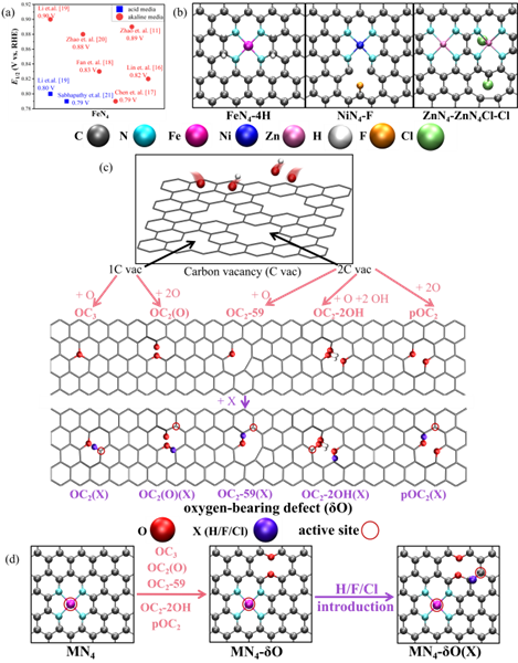 针对上述问题,研究团队基于前期工作基础(Adv. Energy Mater.2022, 2203159),利用第一性原理计算,重点研究石墨烯材料中不可避免的含氧缺陷的贡献。首先通过证实实验结果,即在富氢热解环境中合成的Fe-N-C SACs表现出增强的氧还原反应(ORR)活性和稳定性,证明了FeN4位点附近必定存在含氧缺陷。此外,这些缺陷邻近的sp3杂化碳原子易于吸附氢原子,从而额外激活碳原子作为活性位点——这为通过缺陷工程增加活性位点密度提供了新的思路。同时,团队修正了前人对Fe-N-C 型SACs催化小分子(如O₂、CO₂、N₂)还原反应机理的认知,并阐明了实验课题组报道的FeN4催化性能差异的根源。另外,团队进一步提出了针对M-N-C 型SACs活性位点的标准化建模策略,以此揭示了氟化NiN₄、氯化ZnN₄对二氧化碳还原和氧还原反应的活性位点和催化机制,解决了以往研究中关于官能团化的MN4 SACs活性位点建模不统一的问题。综上,本工作成功解决了M-N-C型SACs领域的三个难题,为加深理解其构效关系提供了新的思路。