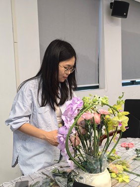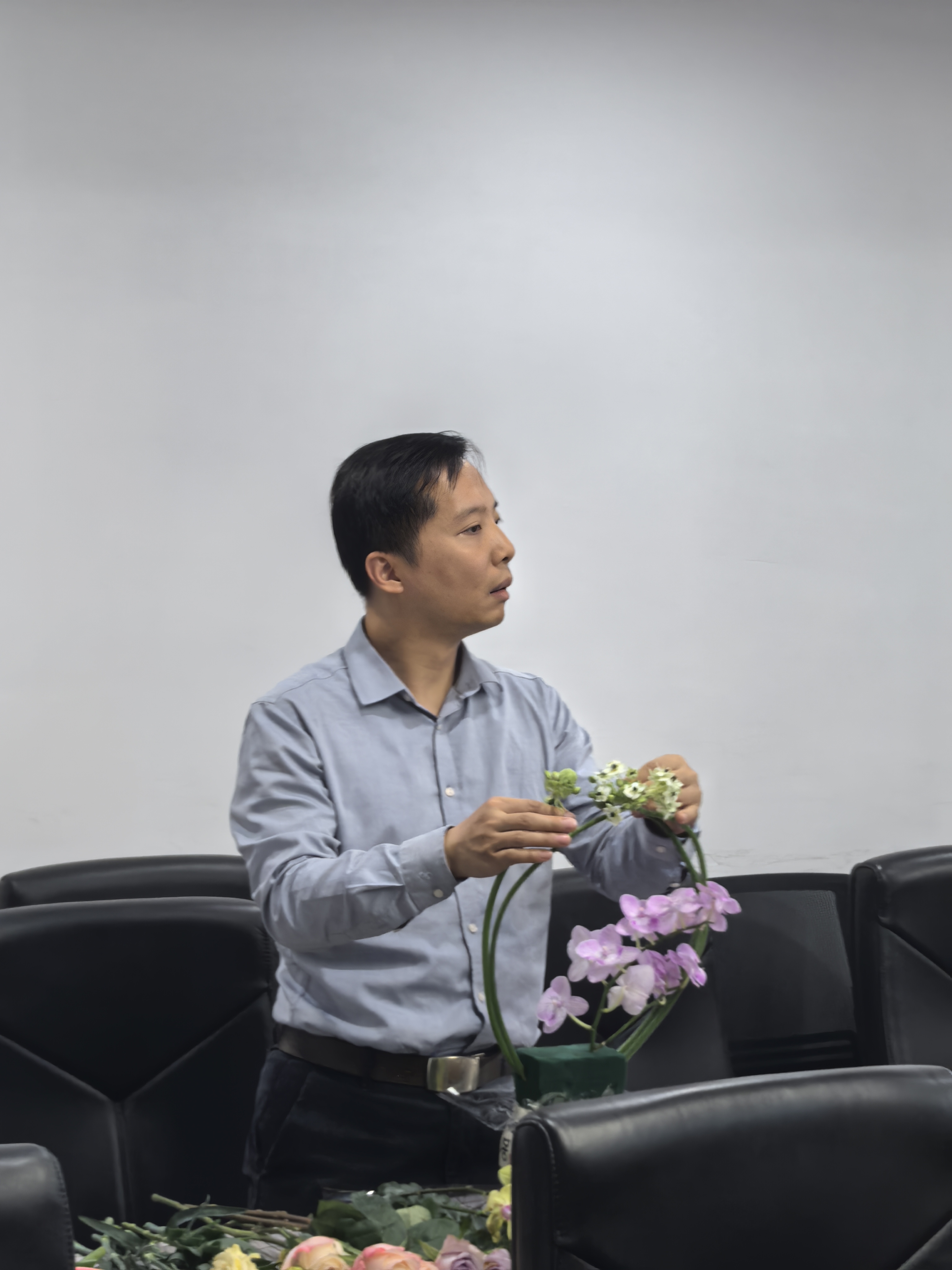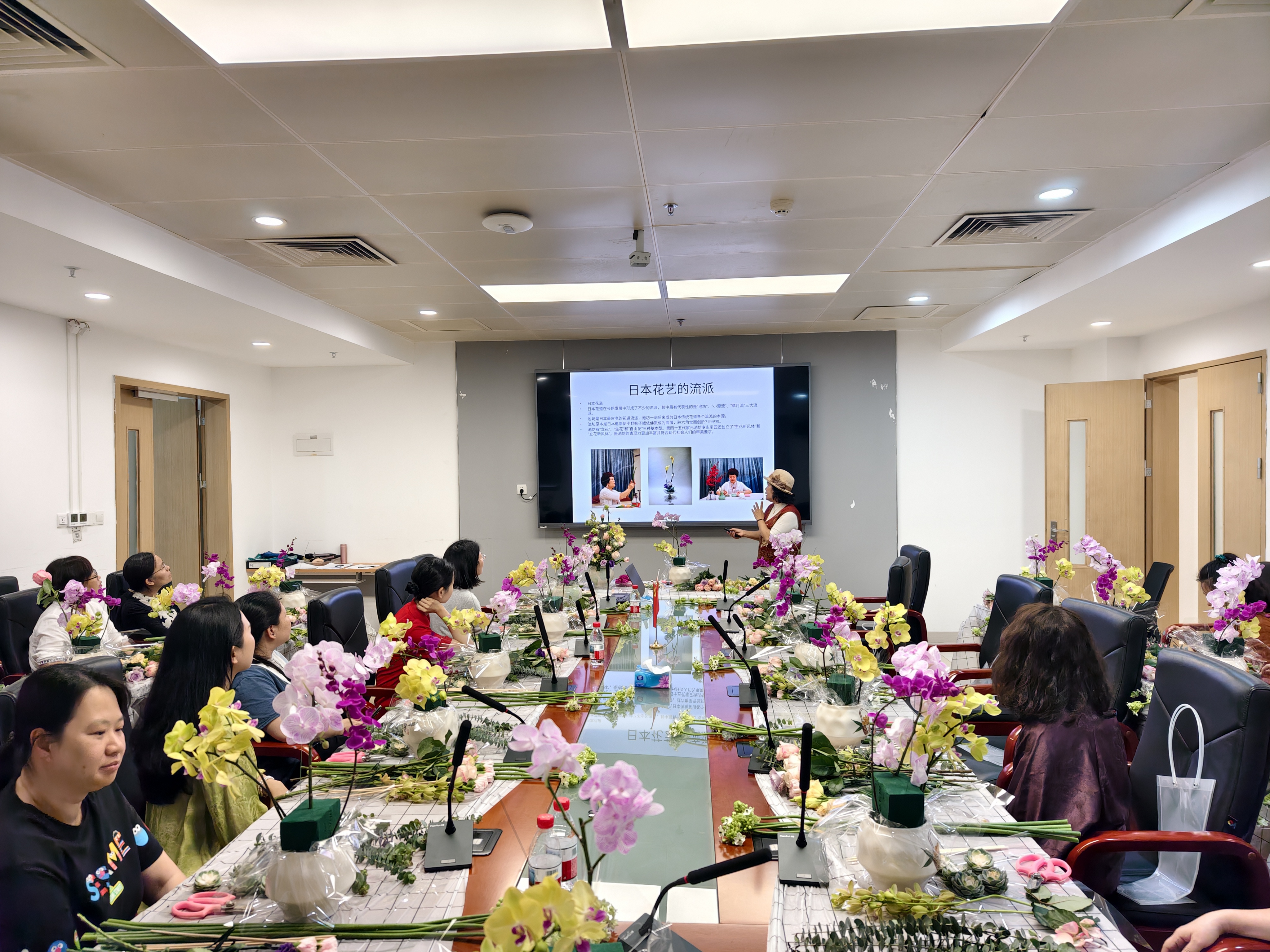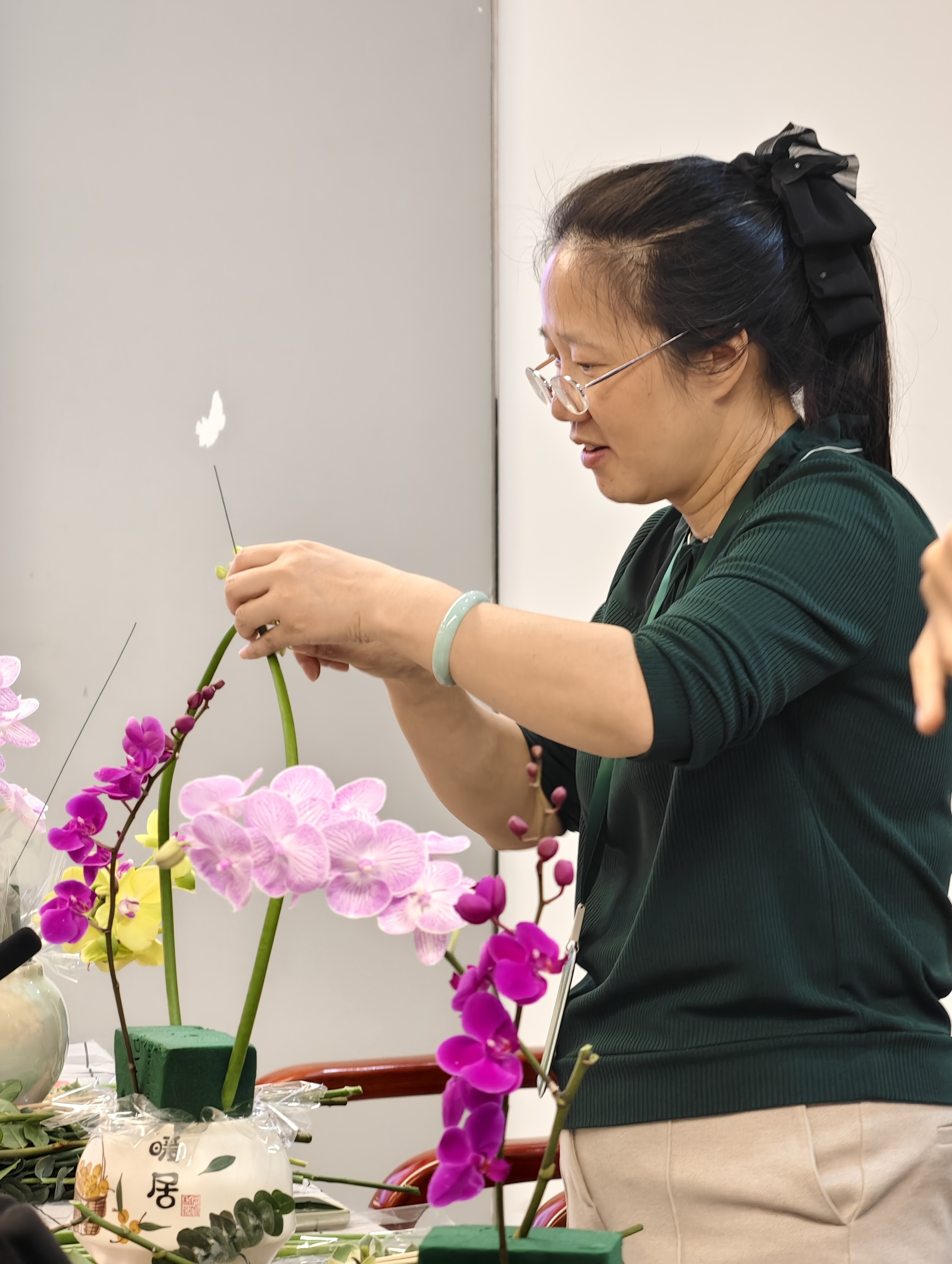 本次花艺活动以“专业指导+实践创作”为核心,特邀资深花艺师现场授课。活动选取蝴蝶兰、玫瑰、洋桔梗、尤加利叶等春日花材,结合“色彩搭配”与“空间构图”,引导教职工在插花过程中感受“花与艺、心与美”的融合。活动现场,花艺师首先讲解花材的寓意与养护技巧,从“主花与配叶的搭配”到“高低错落的层次感”,将专业知识与审美理念娓娓道来。随后,教职工们开始动手实践,修剪枝叶、搭配花材、调整造型,指尖翻飞间,一盆盆兼具“个人风格”与“艺术美感”的花艺作品逐渐成型。