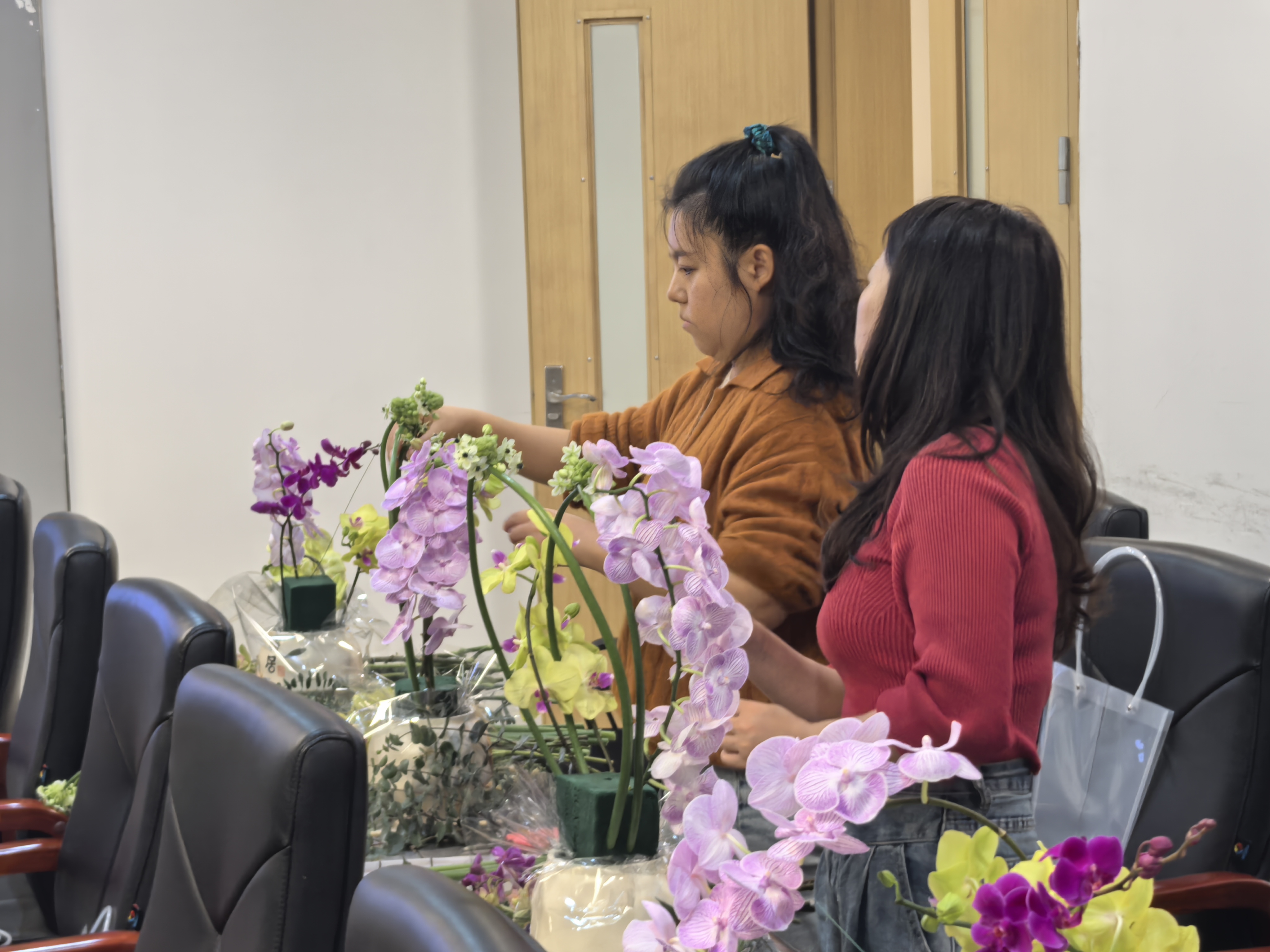 春和景明,芳华灼灼。为丰富教职工精神文化生活,展现新时代女教职工“柔肩担重任、巾帼绽芳华”的精神风貌,3月20日下午,材料科学与工程学院分工会在东校园化学材料综合楼C213室举办“芳花艺韵 巾帼风华”主题花艺活动。学院工会主席杨建文出席活动,学院党委副书记许俊卿等20余位教职工齐聚一堂,以花为媒、以艺润心,共赴一场春日里的“美学之约”。