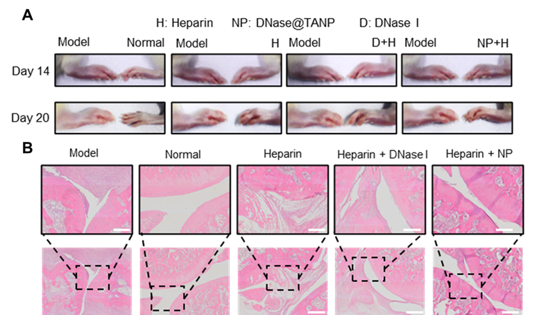 图2. 肝素与 DNase@TANP 联合策略治疗RA模型大鼠