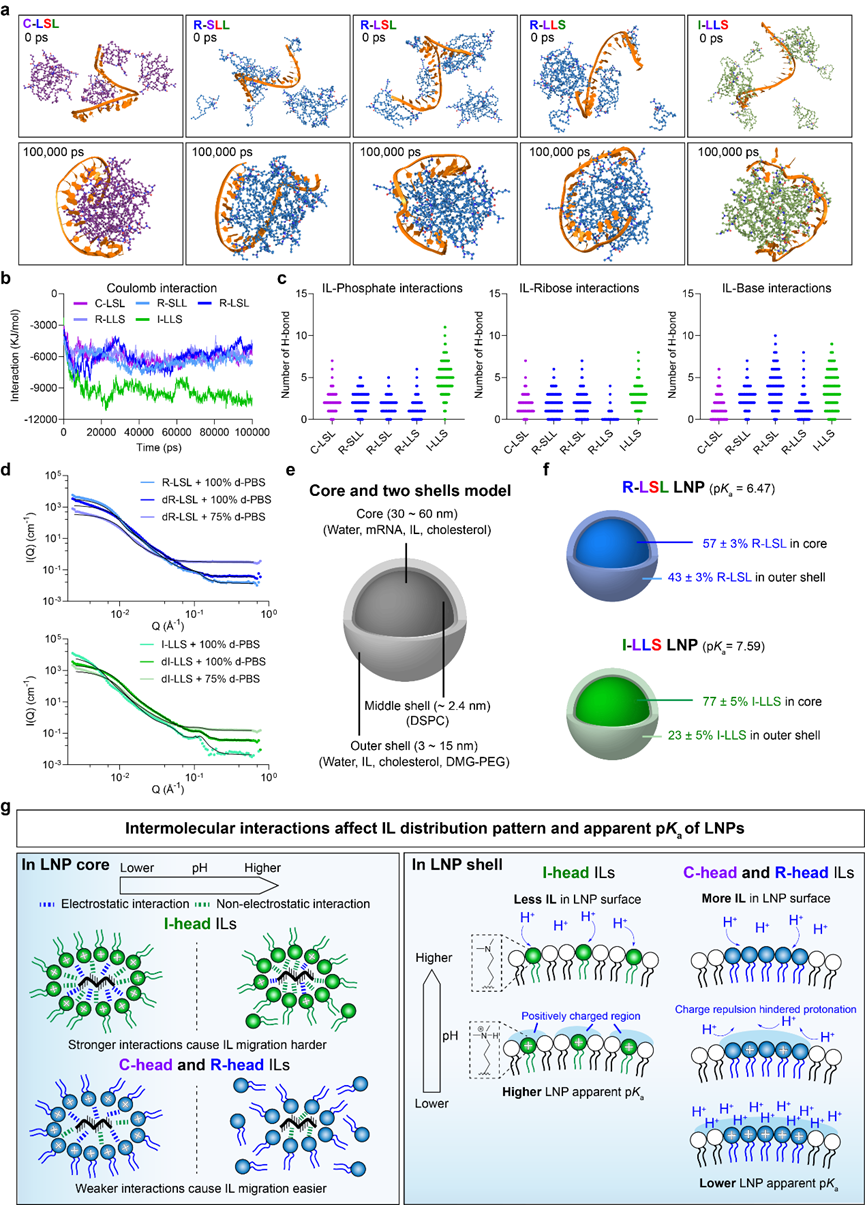 (d-f)通过小角中子散射研究异构IL在LNP中的分布情况;(g)异构IL影响LNP的表观pKa的分子机制